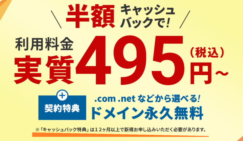 キャンペーン期間中にサーバーを申込み、「12ヶ月」以上で契約すると《利用料金の半額》のキャッシュバックを受け取りできるという企画です。