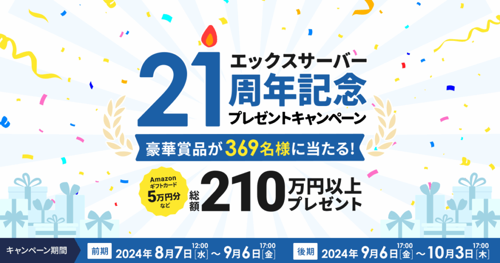 5万円分のAmazonギフトカードや3万円分のUber Eats ギフトカードなど総額210万円以上の豪華賞品が抽選で369名に当たる21周年記念プレゼントキャンペーンを実施します!